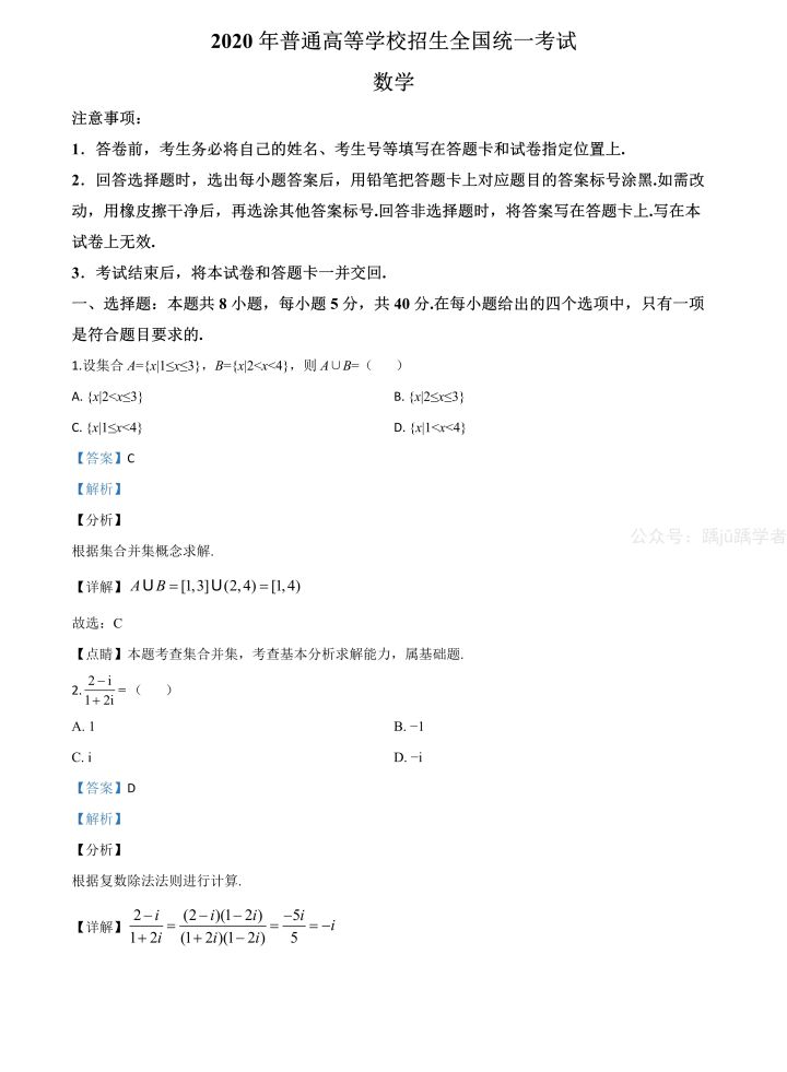 数学是很多考生在高考中的拦路虎,它所占的分值重,分数差距很容易拉开。许多考生在考完数学后就想马上对答案来估计自己的分数,本期小编就为大家整理了2020年海南数学高考真题及答案解析,供2020年考生参考。一、2020年海南数学高考真题及答案解析