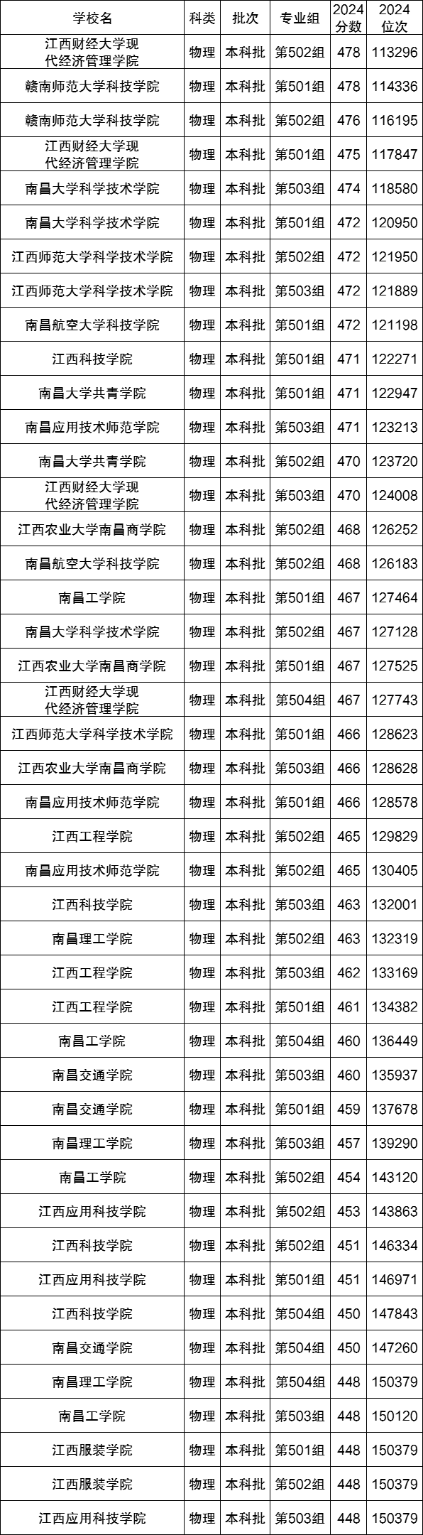 2024年江西的民办本科大学在江西省物理类录取中,收分最高的大学为江西财经大学现代经济管理学院,2024年最低分为478分,最低位次为113296;其次是赣南师范大学科技学院,2024年最低分为476分,最低位次为116195。