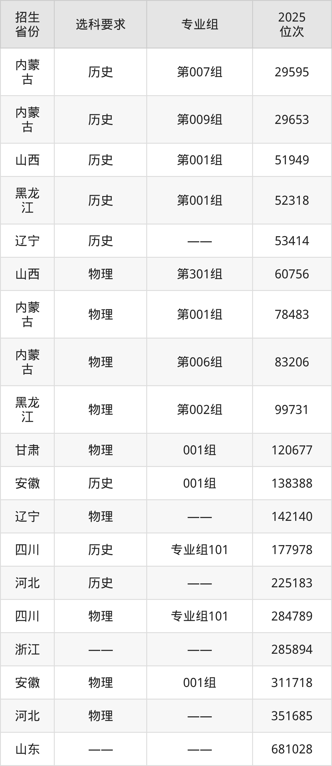 德州工程职业学院2025年在全国各省的位次差异较大,最高位次是29595位(内蒙古历史类)、最低位次是681028位(山东)。各省具体位次请看下图: