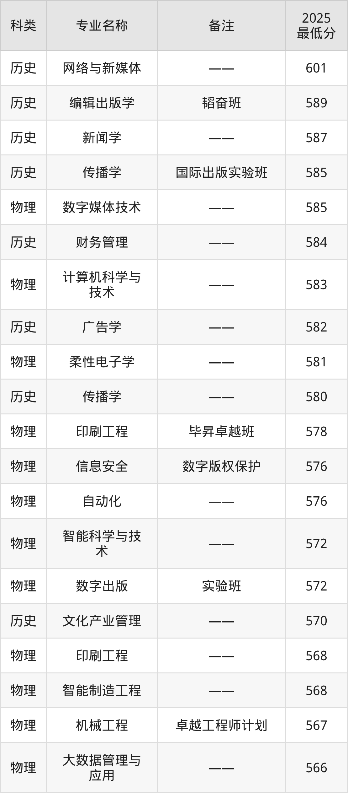下面是根据2025北京印刷学院各专业最低录取分数线排名(历史类):