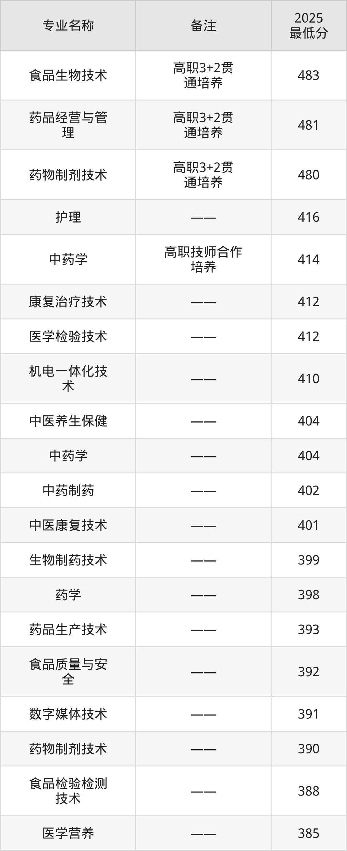 3、药物制剂技术(高职3+2贯通培养):专业最低480分