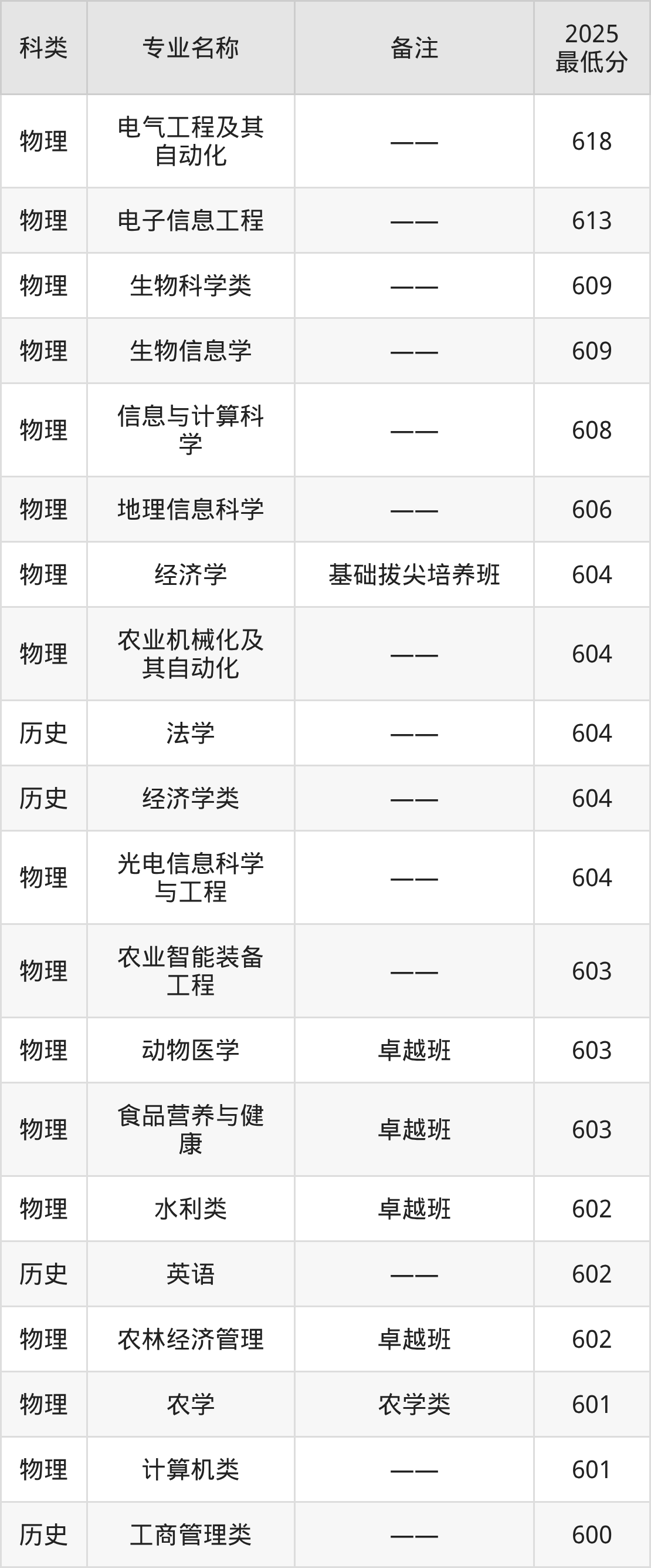 9、农学(农学类):专业最低601分