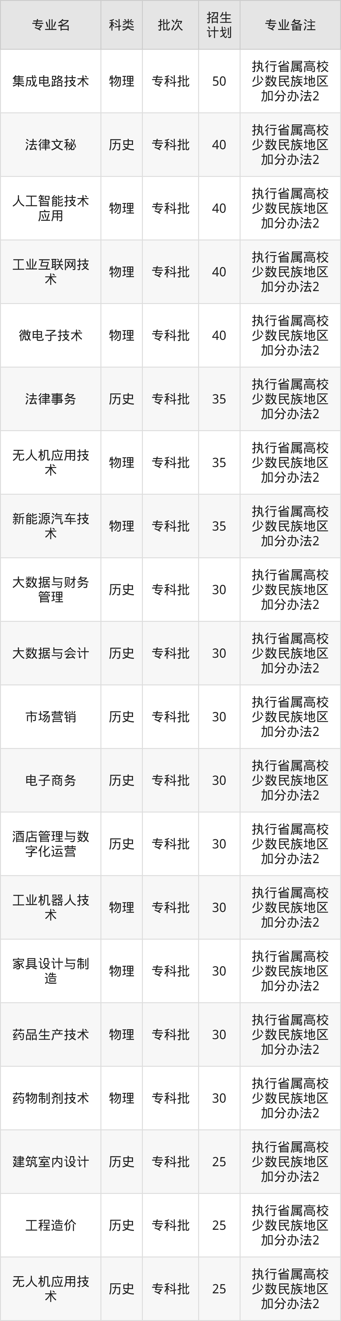 以四川省为例,2025四川现代职业学院在所在省份招生人数共计1261人,其中人数最多的专业为集成电路技术(执行省属高校少数民族地区加分办法2),共计50人,该专业选科要求为必选物理+不限。一般来说,招生人数越多,专业低分录取的概率就越大,具体可参考当地最终录取数据。