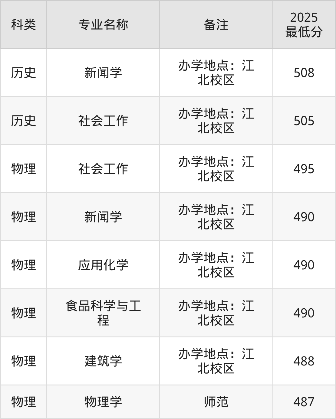1、社会工作(办学地点:江北校区):专业最低495分