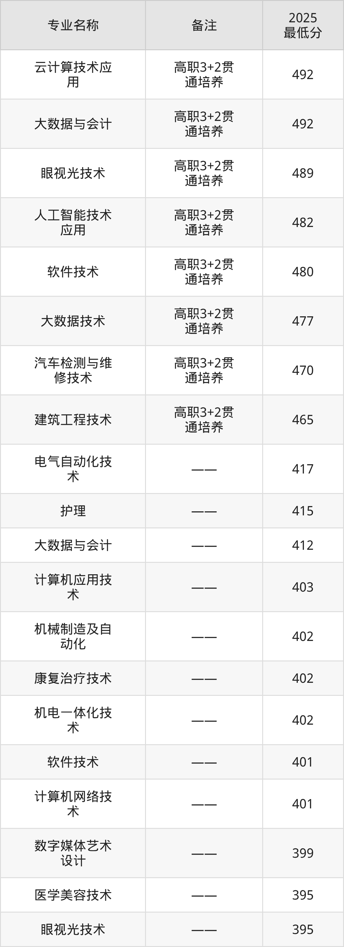 1、云计算技术应用(高职3+2贯通培养):专业最低492分