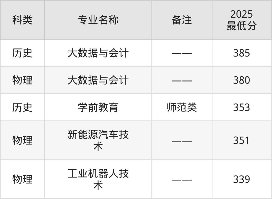 2025年民办合肥财经职业学院专业录取分数线排名最高的是大数据与会计(历史类385分),分数线排名最低的是工业机器人技术(物理类339分)。