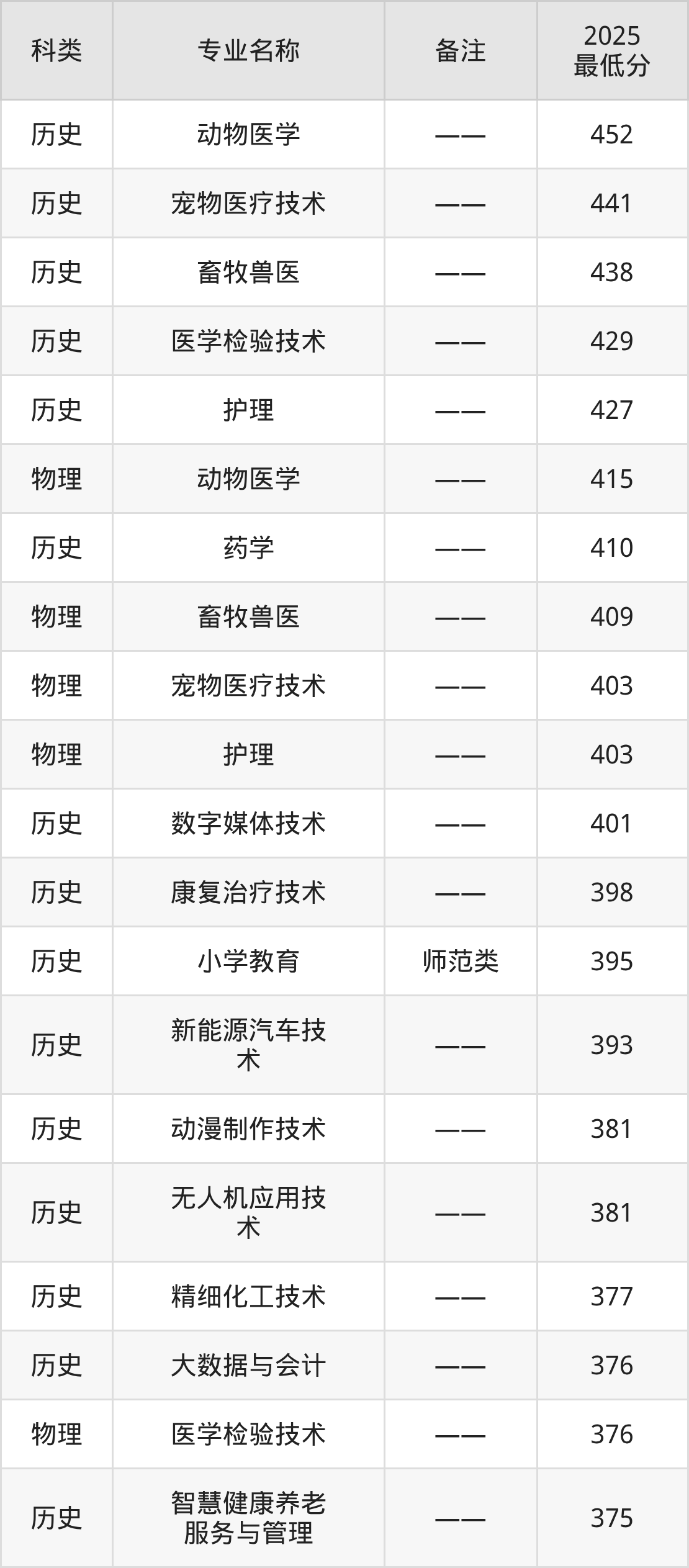 2025年阜新高等专科学校专业录取分数线排名最高的是动物医学(历史类452分),分数线排名最低的是研学旅行管理与服务(物理类275分)。