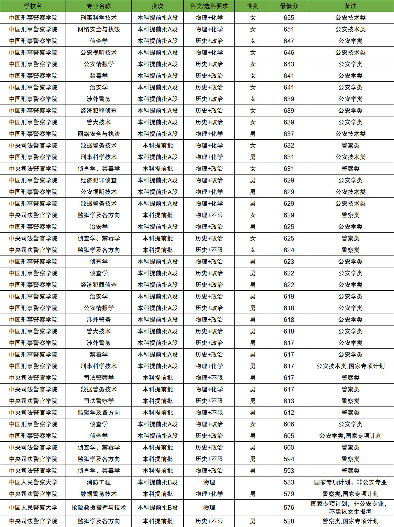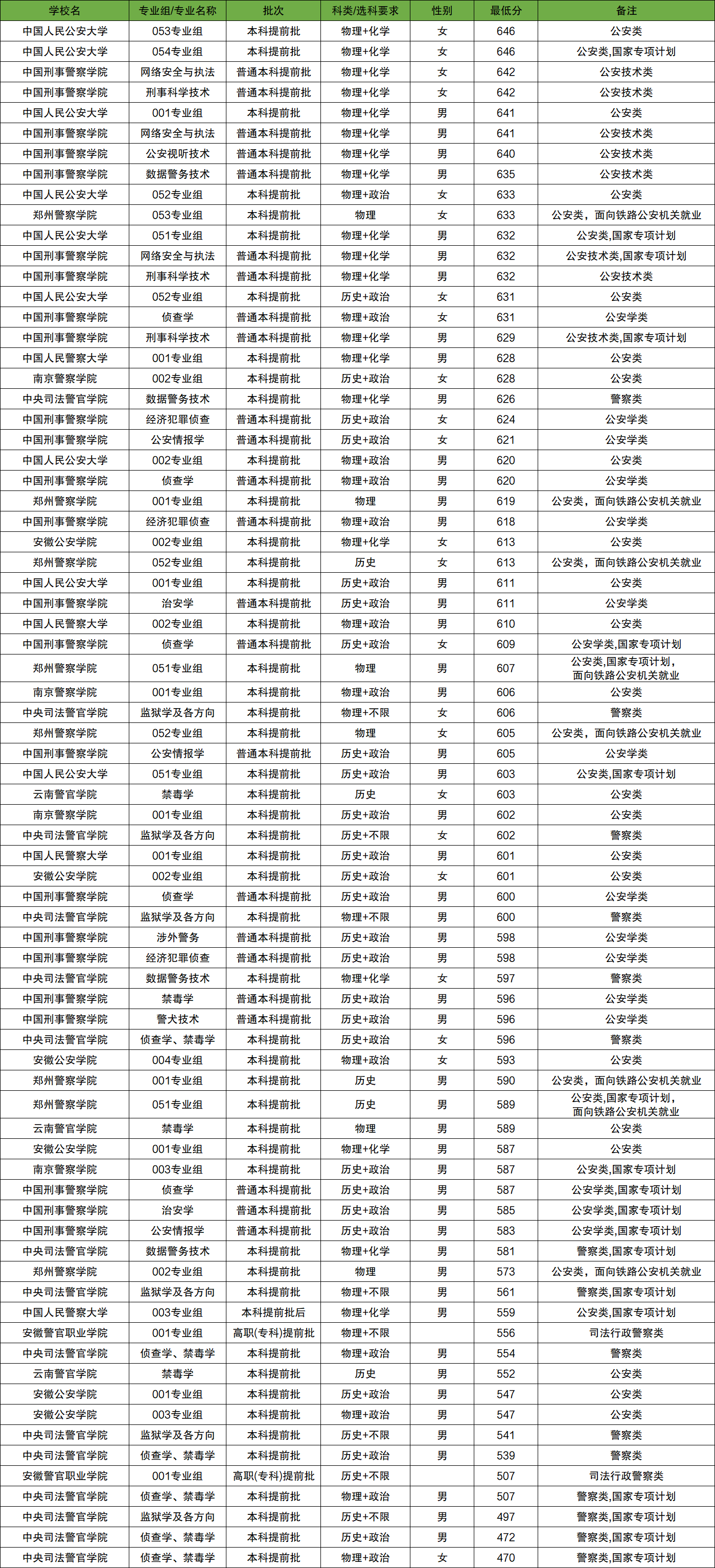 2025全国警察学院在物理类录取分数线578分-651分。最高录取分数线对应院校:中国刑事警察学院(网络安全与执法、女生);最低录取分数线对应院校:中央司法警官学院(侦查学、禁毒学、男生)。