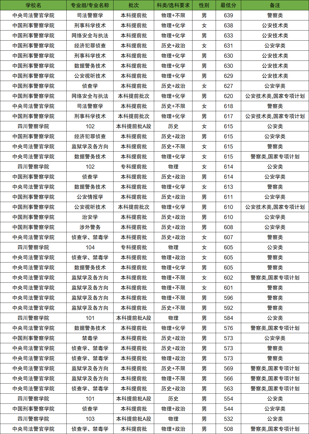 2025年四川警校录取分数线一览表(可滑动查看):