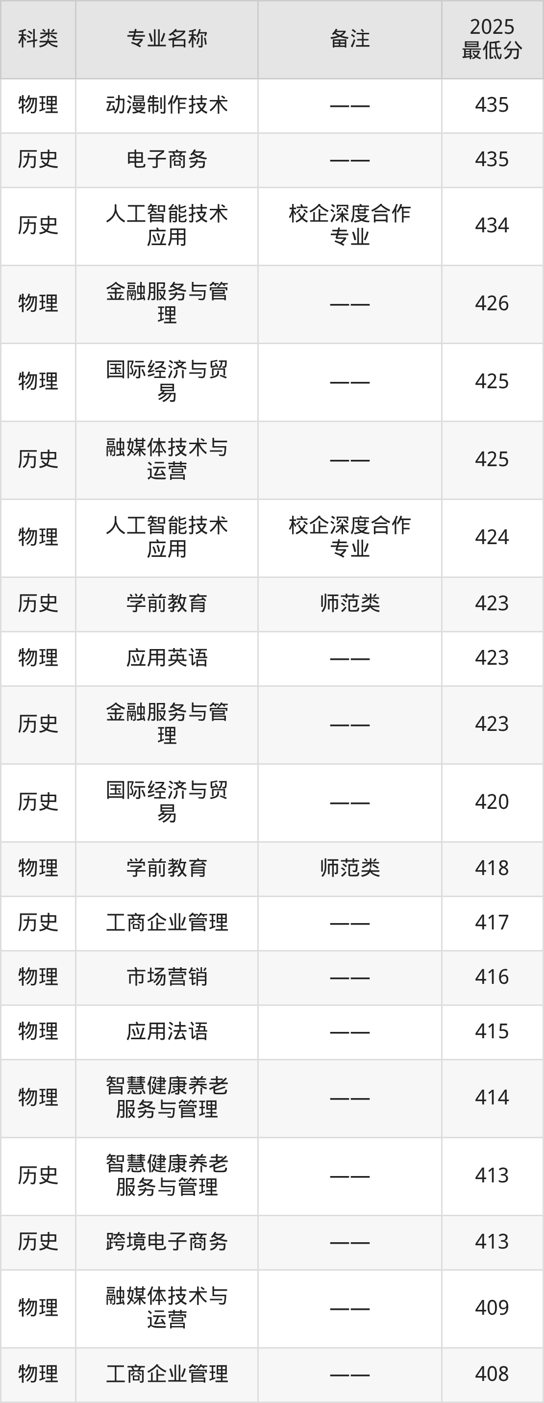 11、人工智能技术应用(校企深度合作专业):专业最低434分