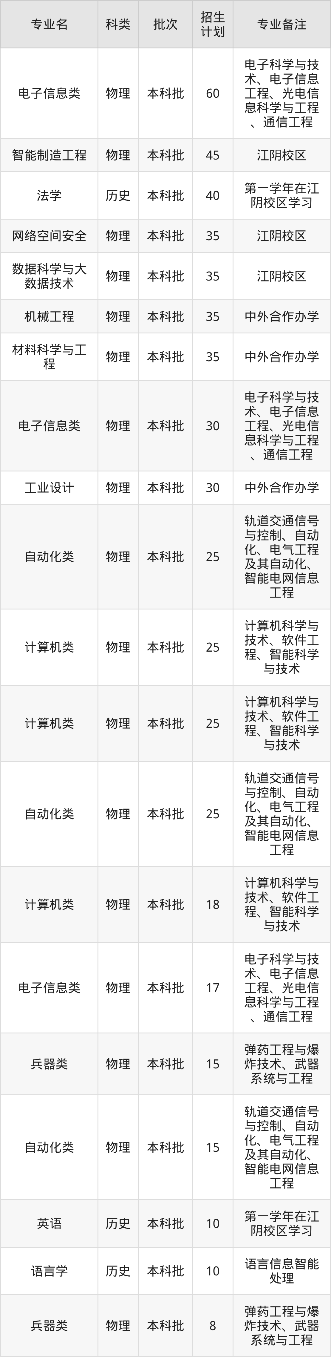 以江苏省为例,2025南京理工大学在所在省份招生人数共计577人,其中人数最多的专业为电子信息类(电子科学与技术、电子信息工程、光电信息科学与工程、通信工程),共计60人,该专业选科要求为必选物理+化学。一般来说,招生人数越多,专业低分录取的概率就越大,具体可参考当地最终录取数据。