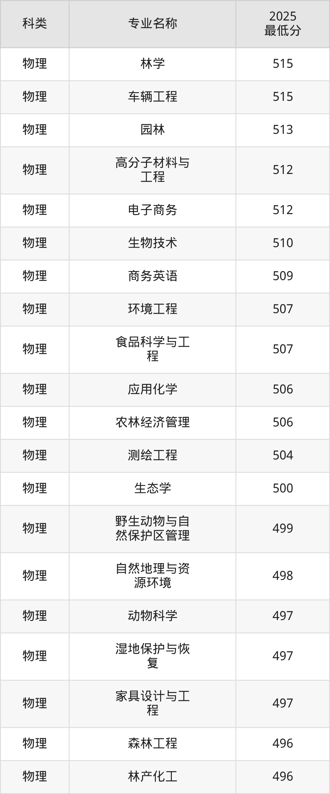 24、木材科学与工程:专业最低491分