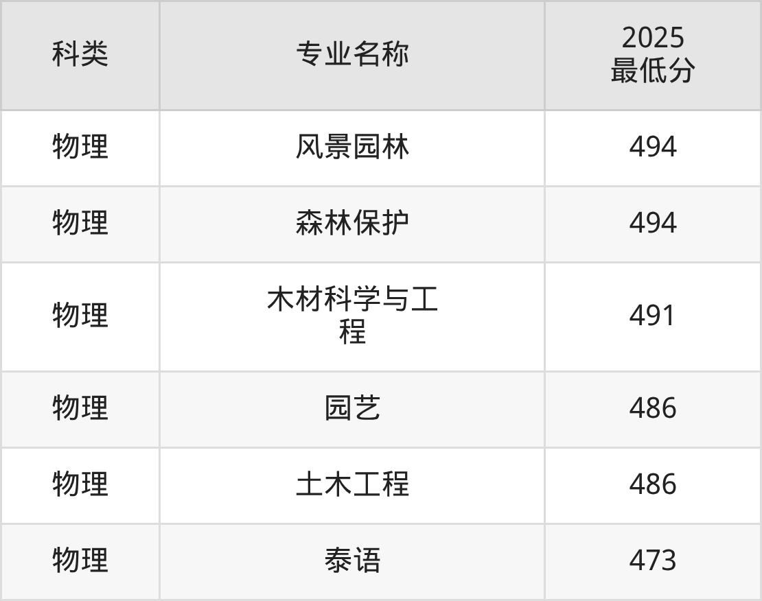 下面是根据2025西南林业大学各专业最低录取分数线排名(物理类):