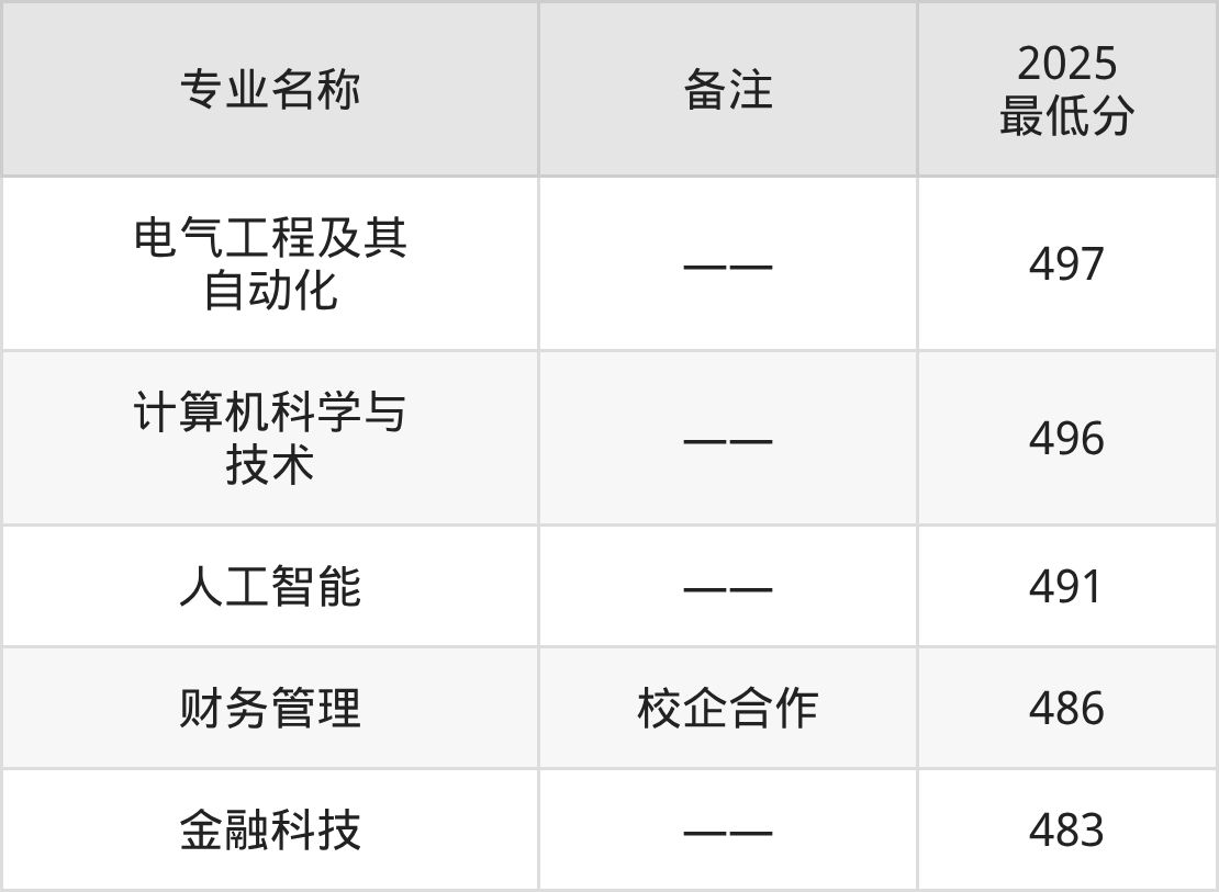2025年安徽新华学院专业录取分数线排名最高的是电气工程及其自动化(物理类497分),分数线排名最低的是金融科技(物理类483分)。