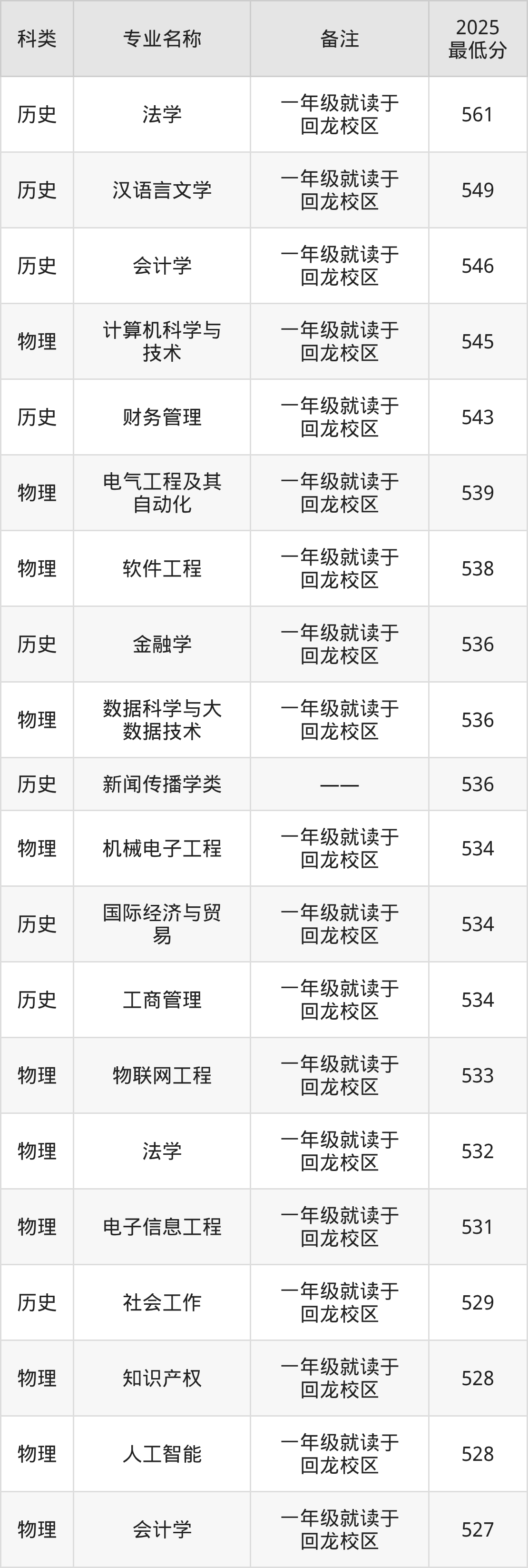 1、计算机科学与技术(一年级就读于回龙校区):专业最低545分