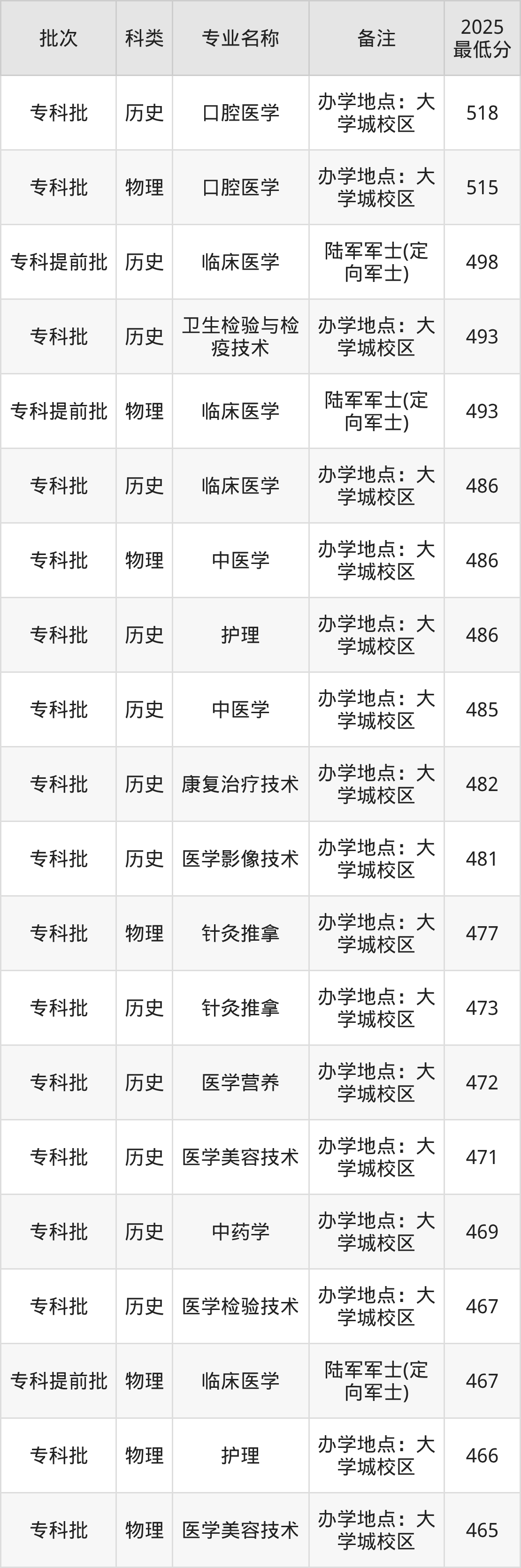 2025年重庆医药高等专科学校专业录取分数线排名最高的是口腔医学(办学地点:大学城校区)(历史类518分),分数线排名最低的是临床医学(武警军士(定向军士))(物理类347分)。