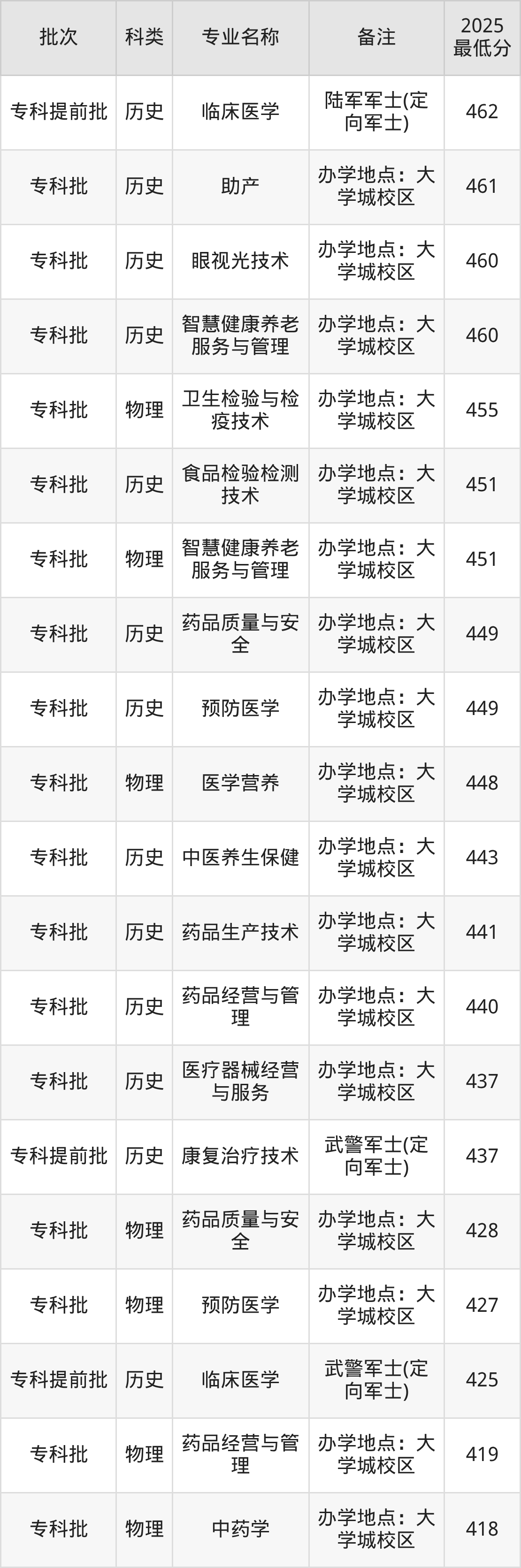 14、眼视光技术(办学地点:大学城校区):专业最低460分