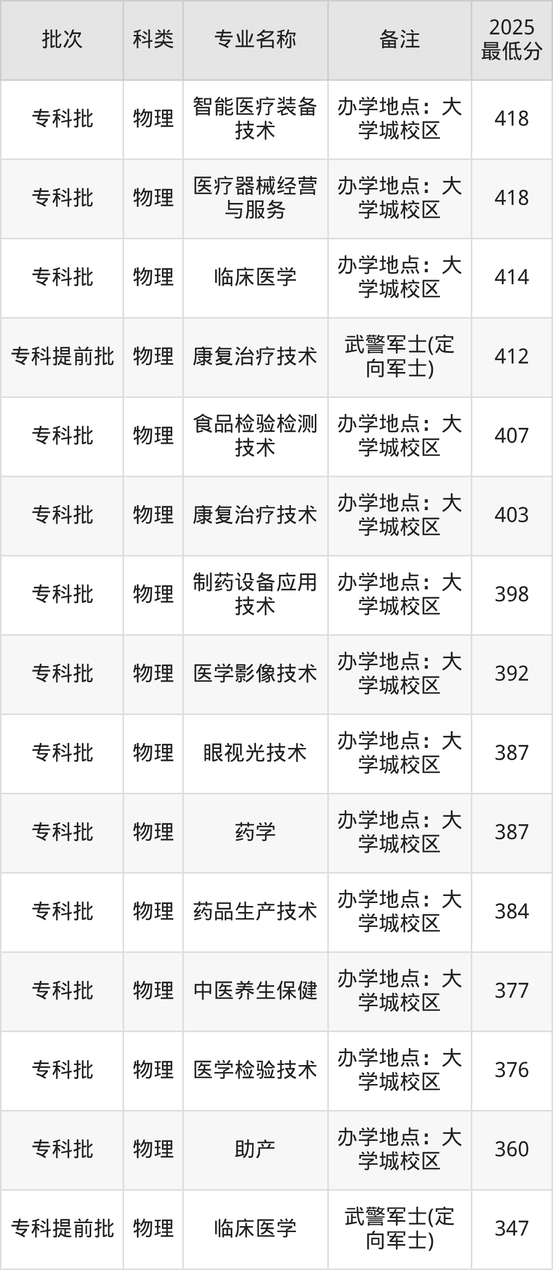 2025年重庆医药高等专科学校各专业在重庆招生分数范围为347分-518分,其中物理类分数最低、最好考的专业是临床医学专业(347分),最低分超专科线167分;历史类分数最低、最好考的专业是临床医学专业(425分),最低分超专科线245分。