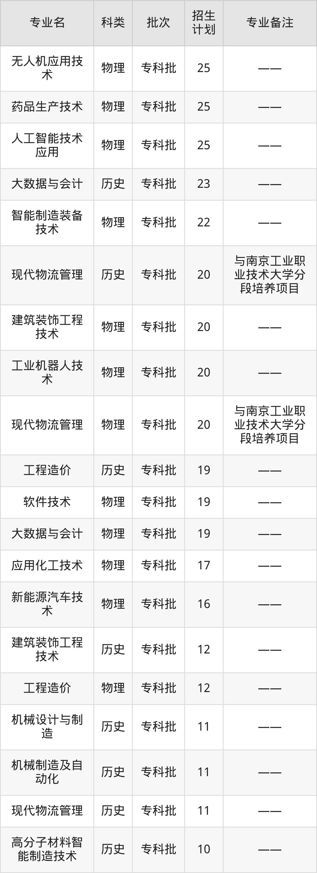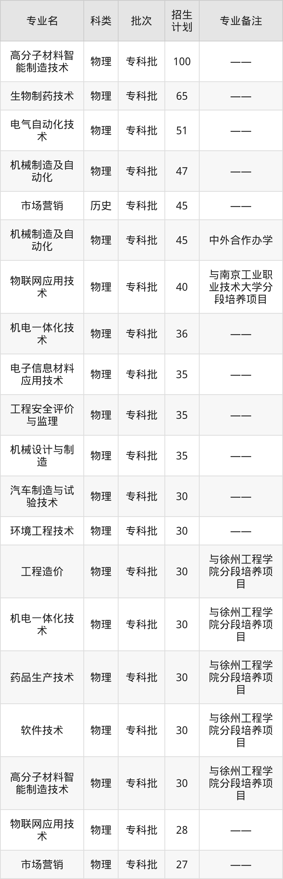 下面是徐州工业职业技术学院2025江苏省招生计划表: