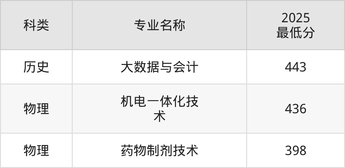 2025年盐城工业职业技术学院专业录取分数线排名最高的是大数据与会计(历史类443分),分数线排名最低的是药物制剂技术(物理类398分)。