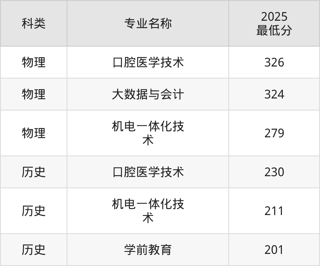 2025年广州珠江职业技术学院专业录取分数线排名最高的是口腔医学技术(物理类326分),分数线排名最低的是学前教育(历史类201分)。