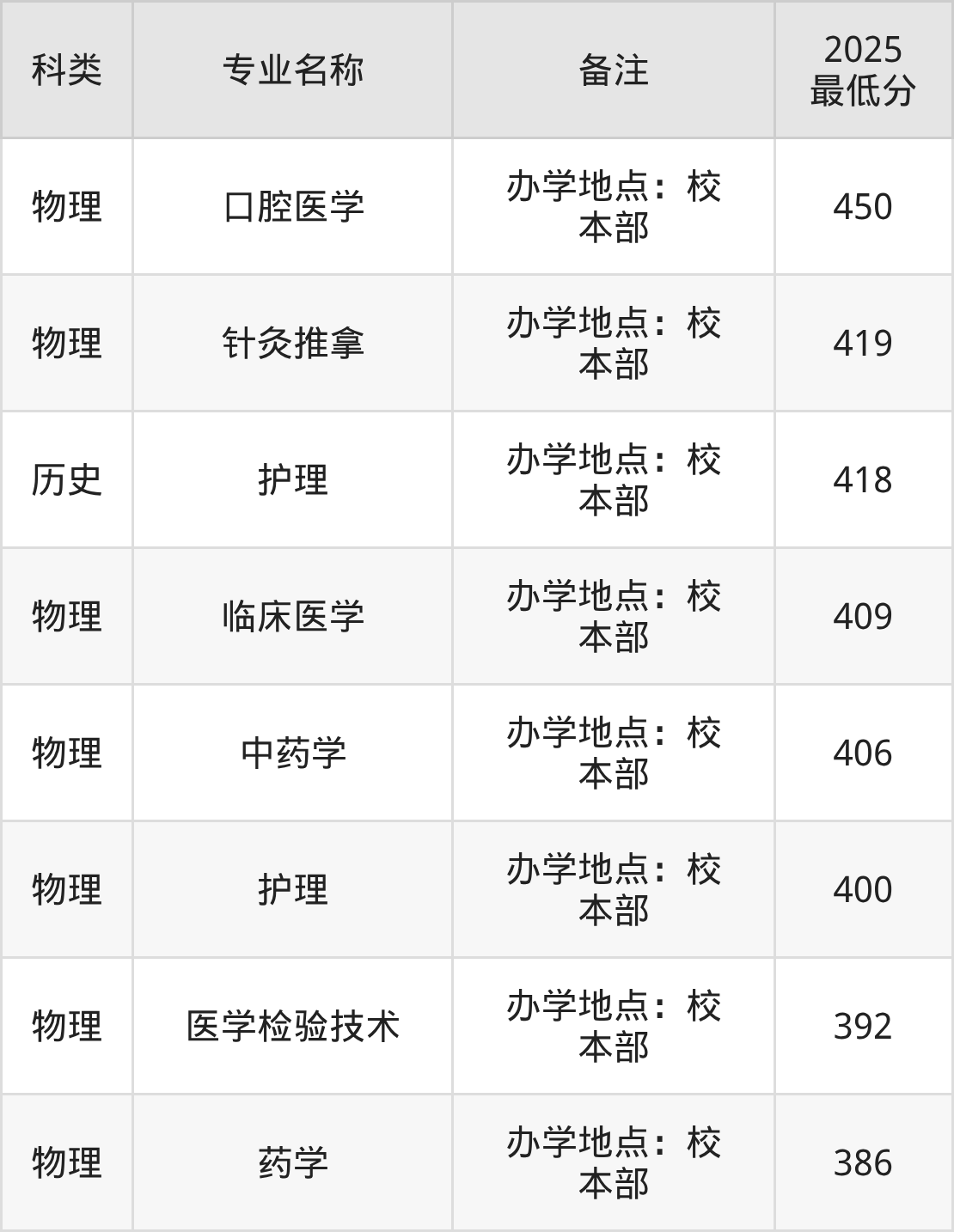 2、针灸推拿(办学地点:校本部):专业最低419分