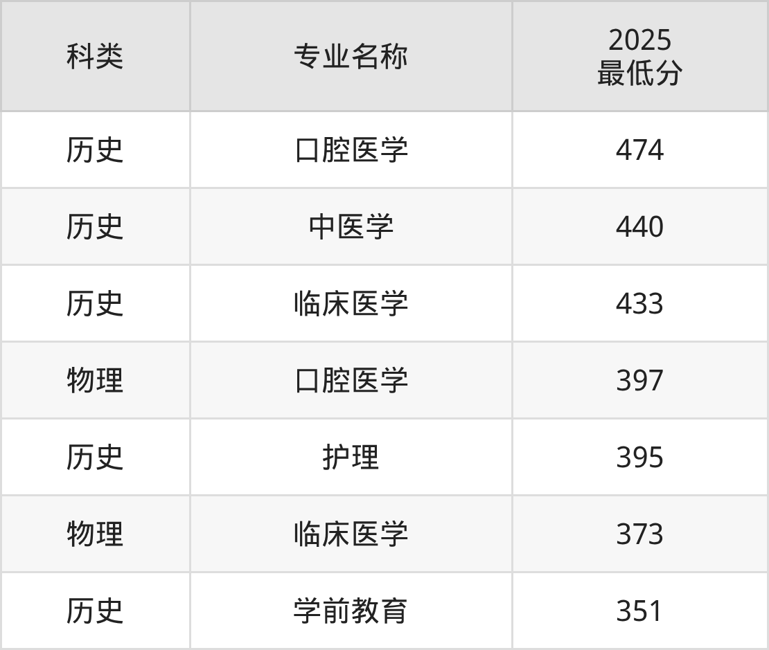 2025年德宏职业学院专业录取分数线排名最高的是口腔医学(历史类474分),分数线排名最低的是学前教育(历史类351分)。