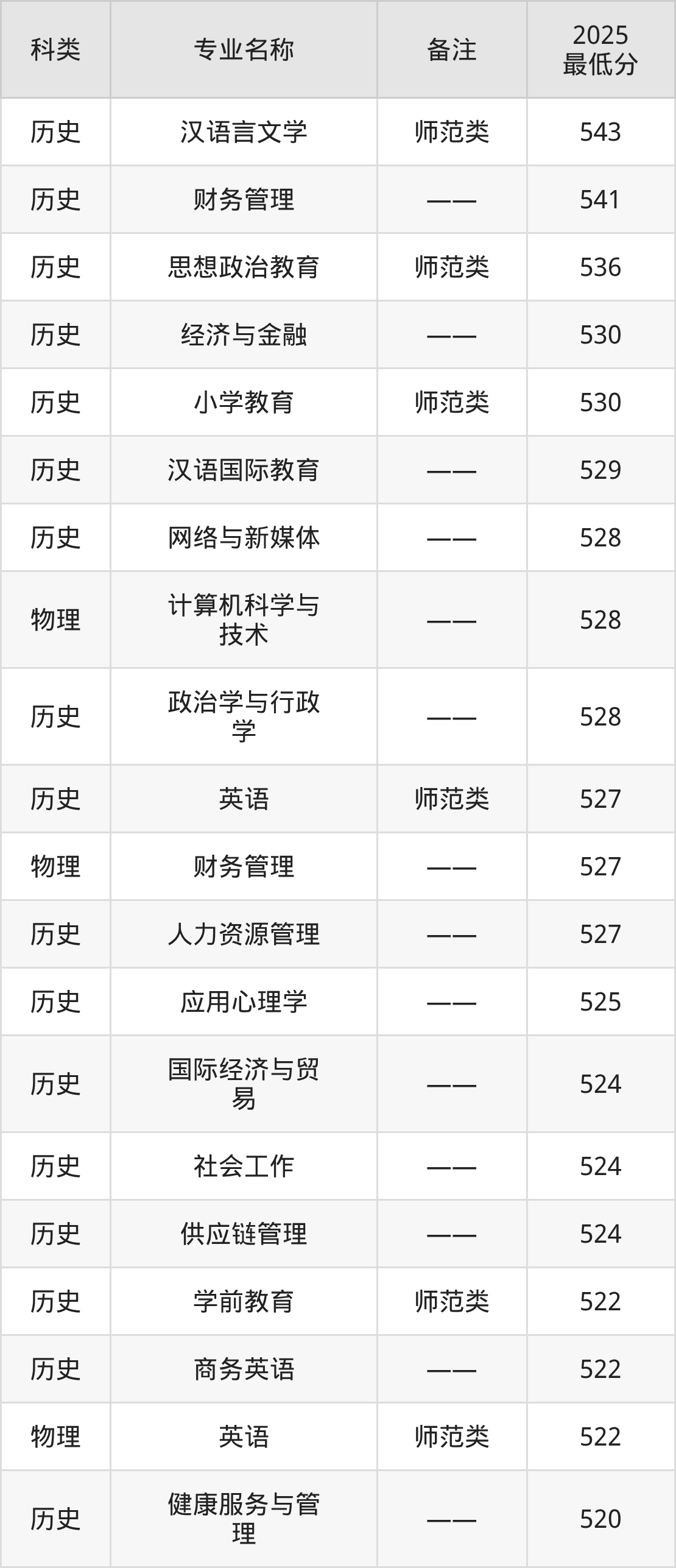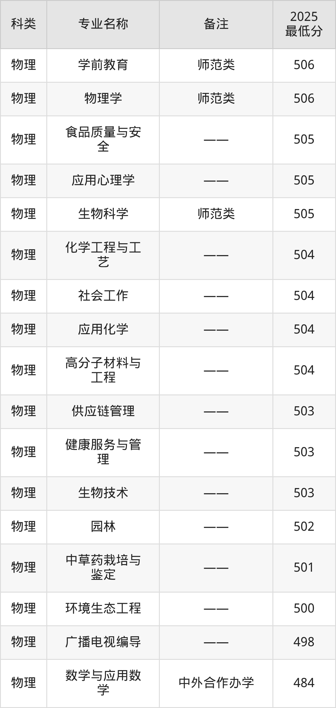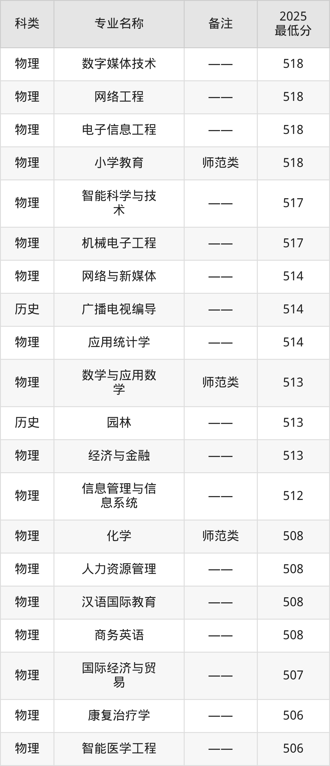 2025年衡水学院各专业在河北招生分数范围为484分-543分,其中物理类分数最低、最好考的专业是数学与应用数学(中外合作办学)专业(484分),最低分超本科线25分;历史类分数最低、最好考的专业是园林专业(513分),最低分超本科线36分。