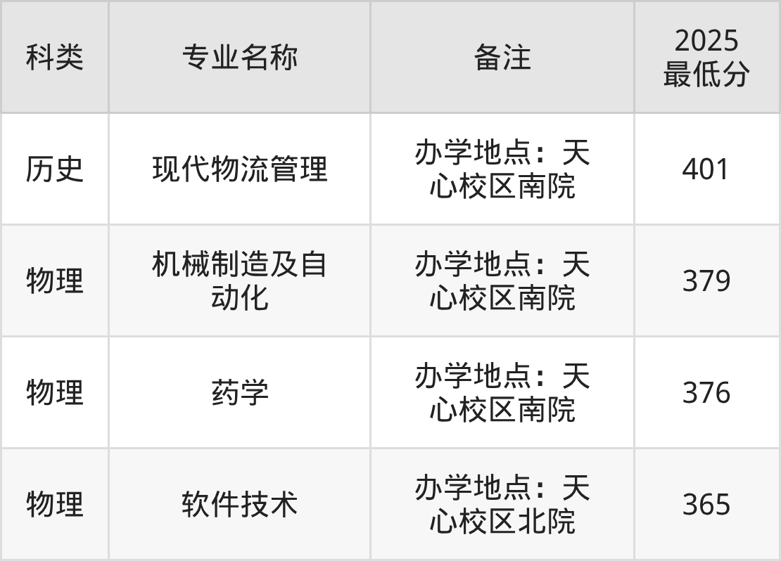 2025年湖南科技职业学院专业录取分数线排名最高的是现代物流管理(办学地点:天心校区南院)(历史类401分),分数线排名最低的是软件技术(办学地点:天心校区北院)(物理类365分)。