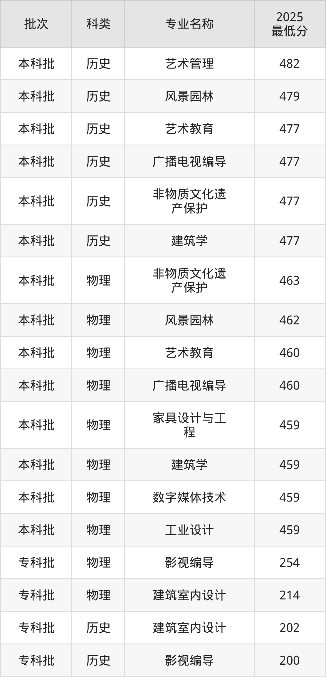 2025年河北美术学院各专业在河北招生分数范围为200分-482分,其中历史类分数最低、最好考的专业是影视编导专业(200分),最低分刚好压专科线;物理类分数最低、最好考的专业是建筑室内设计专业(214分),最低分超专科线14分。