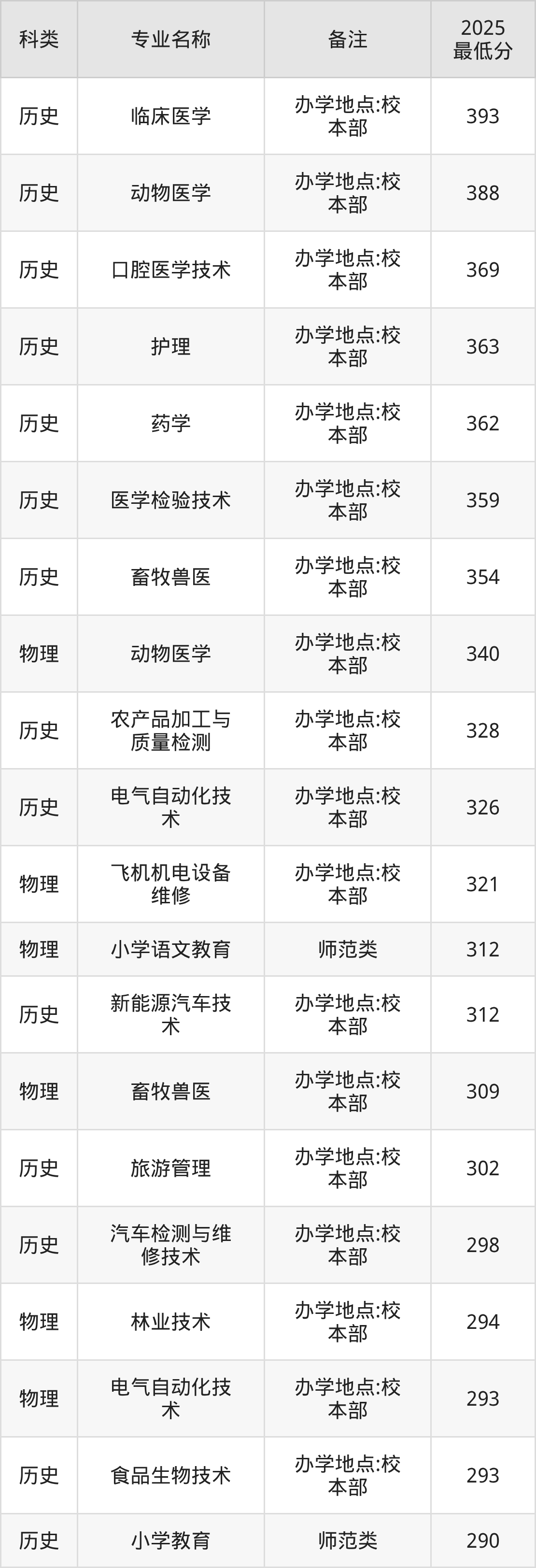4、畜牧兽医(办学地点:校本部):专业最低309分