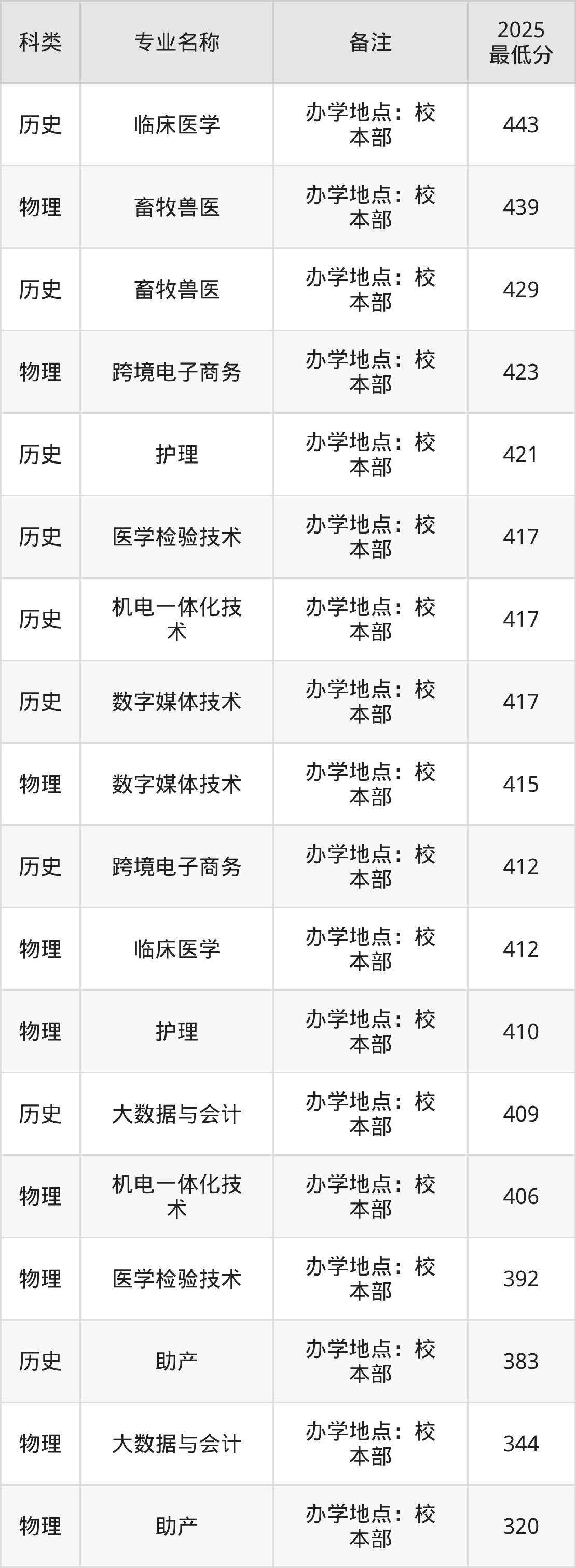 2、畜牧兽医(办学地点:校本部):专业最低429分
