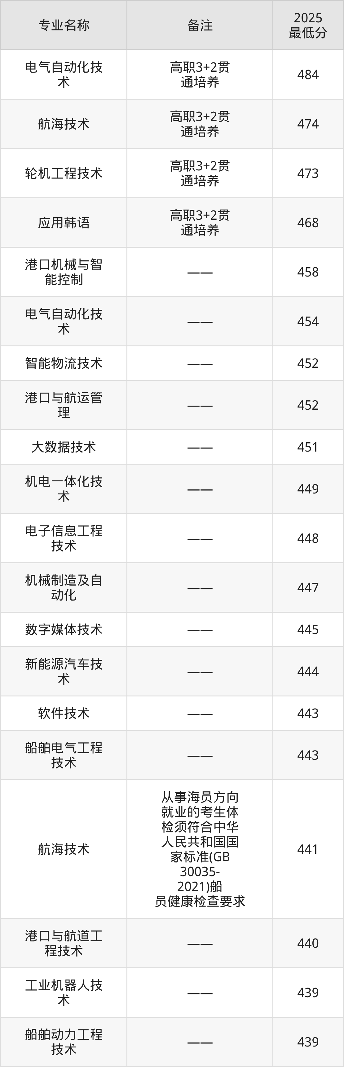 2、航海技术(高职3+2贯通培养):专业最低474分