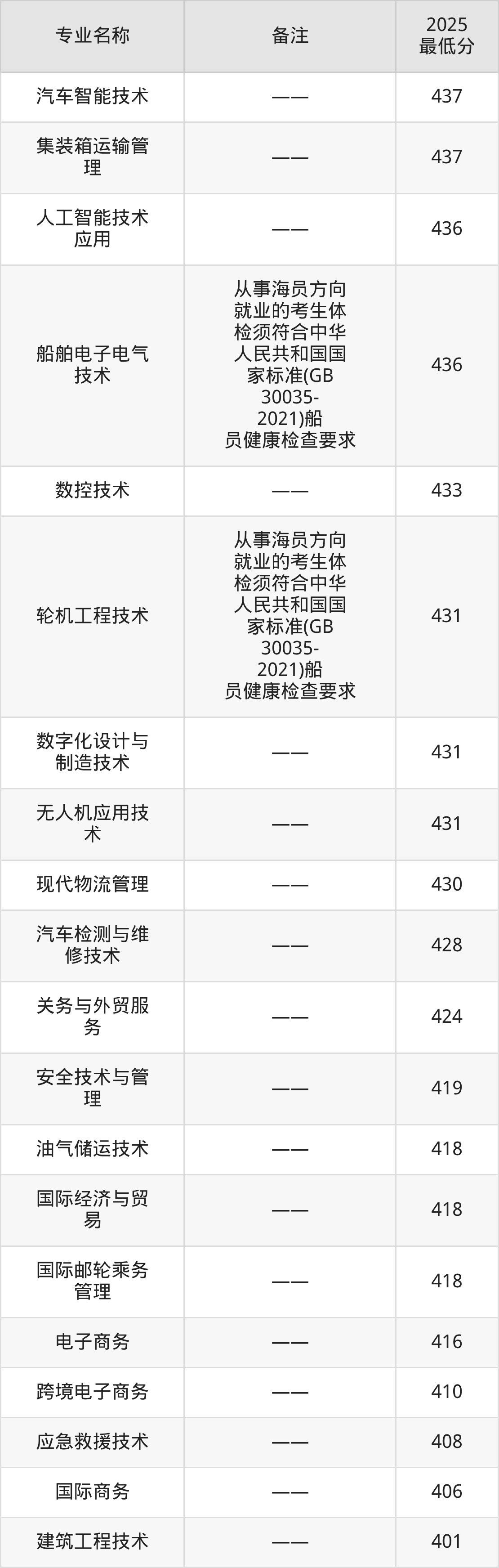 15、航海技术(从事海员方向就业的考生体检须符合中华人民共和国国家标准(GB30035-2021)船员健康检查要求):专业最低441分