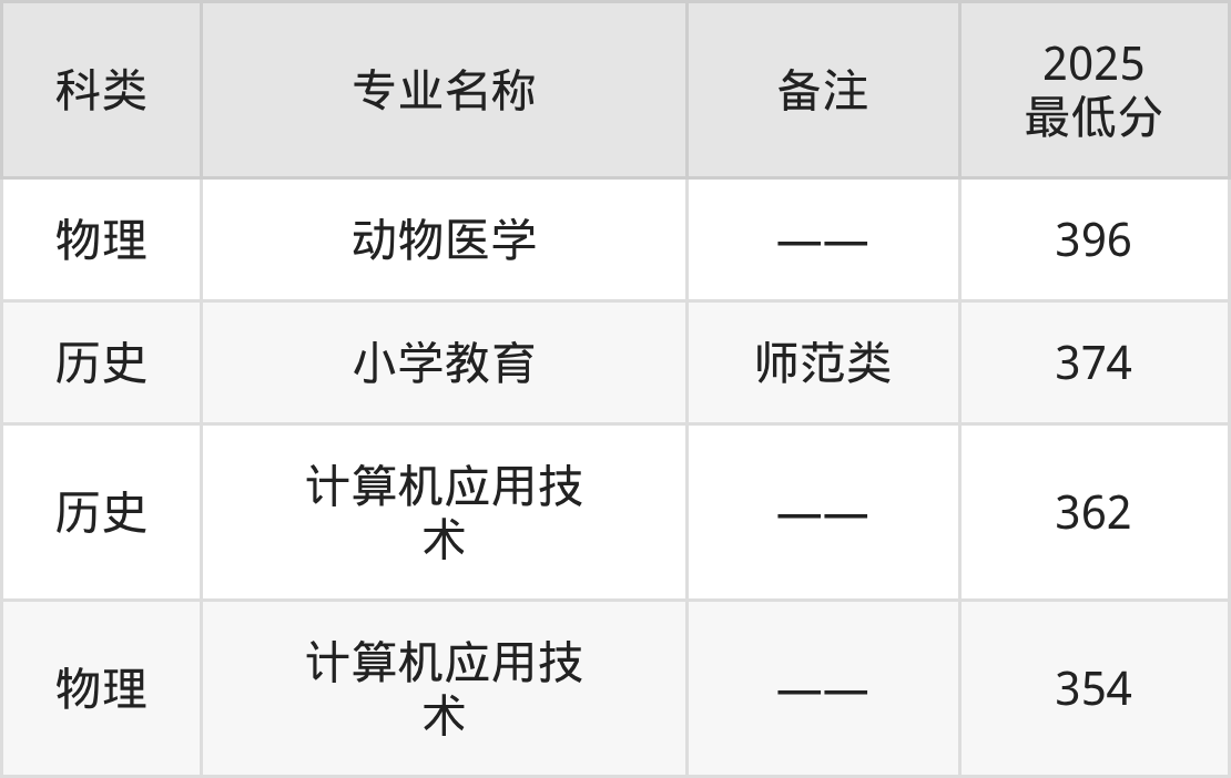 2025年宿州职业技术学院专业录取分数线排名最高的是动物医学(物理类396分),分数线排名最低的是计算机应用技术(物理类354分)。