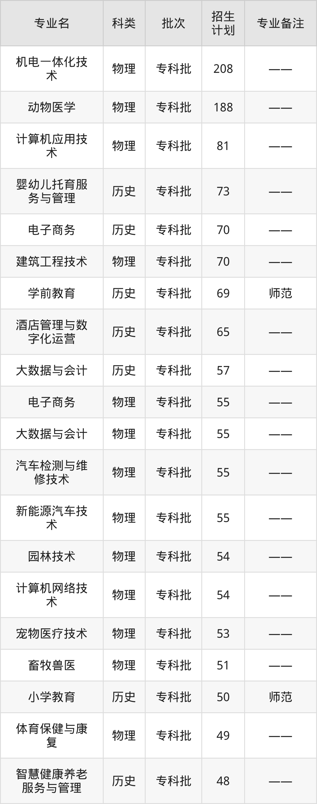 以安徽省为例,2025宿州职业技术学院在所在省份招生人数共计2283人,其中人数最多的专业为机电一体化技术,共计208人,该专业选科要求为必选物理+不限。一般来说,招生人数越多,专业低分录取的概率就越大,具体可参考当地最终录取数据。