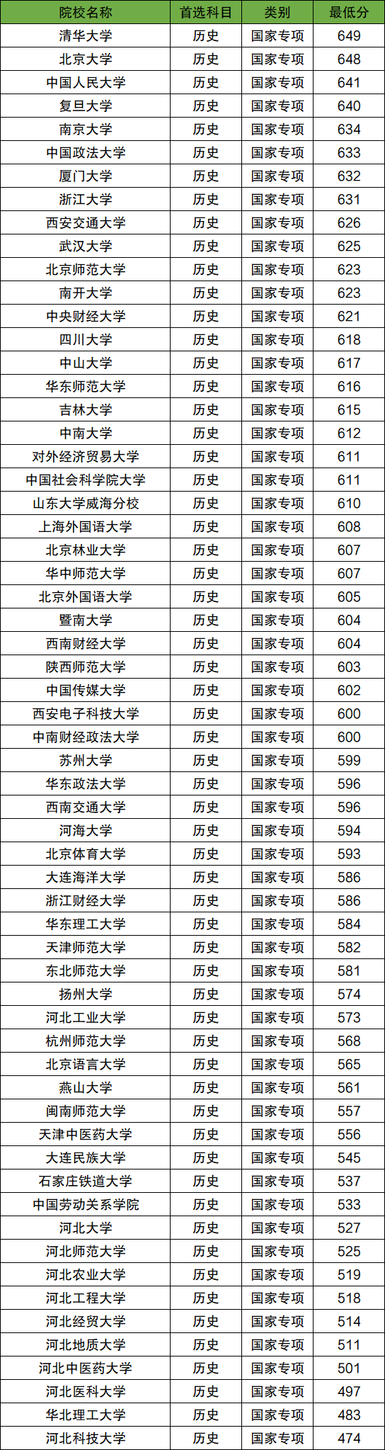 1、复旦大学在河北历史类中,国家专项的录取分数线为640分,高考普通专业最低656分,降低了16分。
