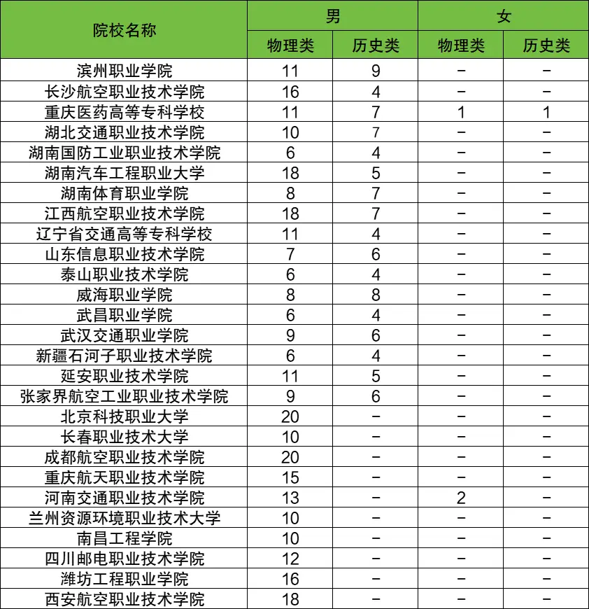 长沙航空职业技术学院(20人):物理类男生16人、历史类男生4人;