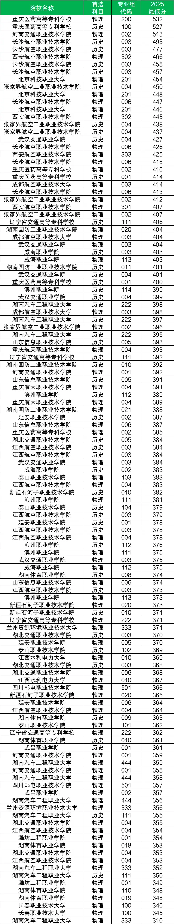 物理类最低分:310分(湖南汽车工程职业大学)。