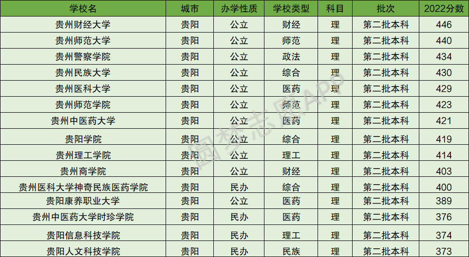 高考100小编整理出了2022年贵阳市分数线最高的二本大学,理科中分数线最高的3所二本大学包括贵州财经大学(446分)、贵州师范大学(440分)、贵州警察学院(434分)。