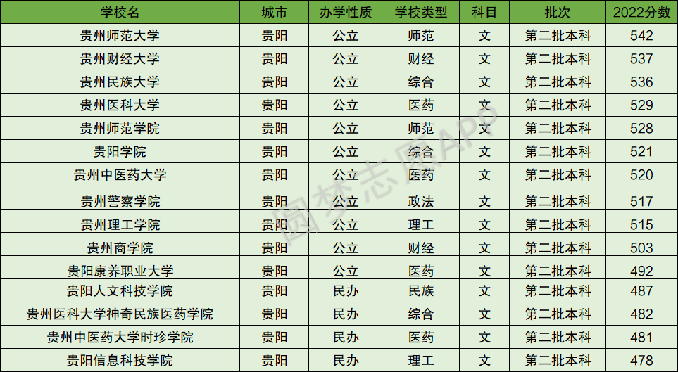 文科中分数线最高的3所二本大学包括贵州师范大学(542分)、贵州财经大学(537分)、贵州民族大学(536分)。