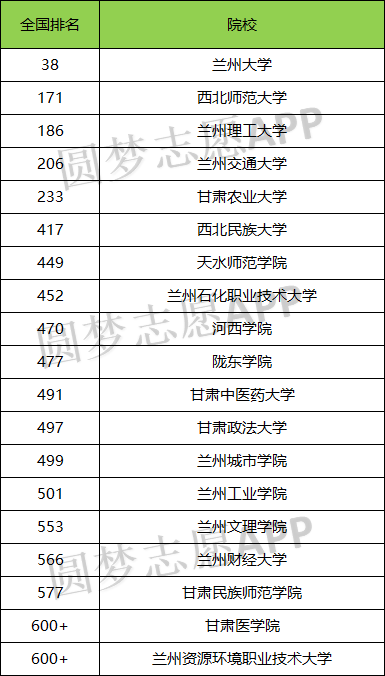 以下为2024年甘肃本科学校完整名单及排名