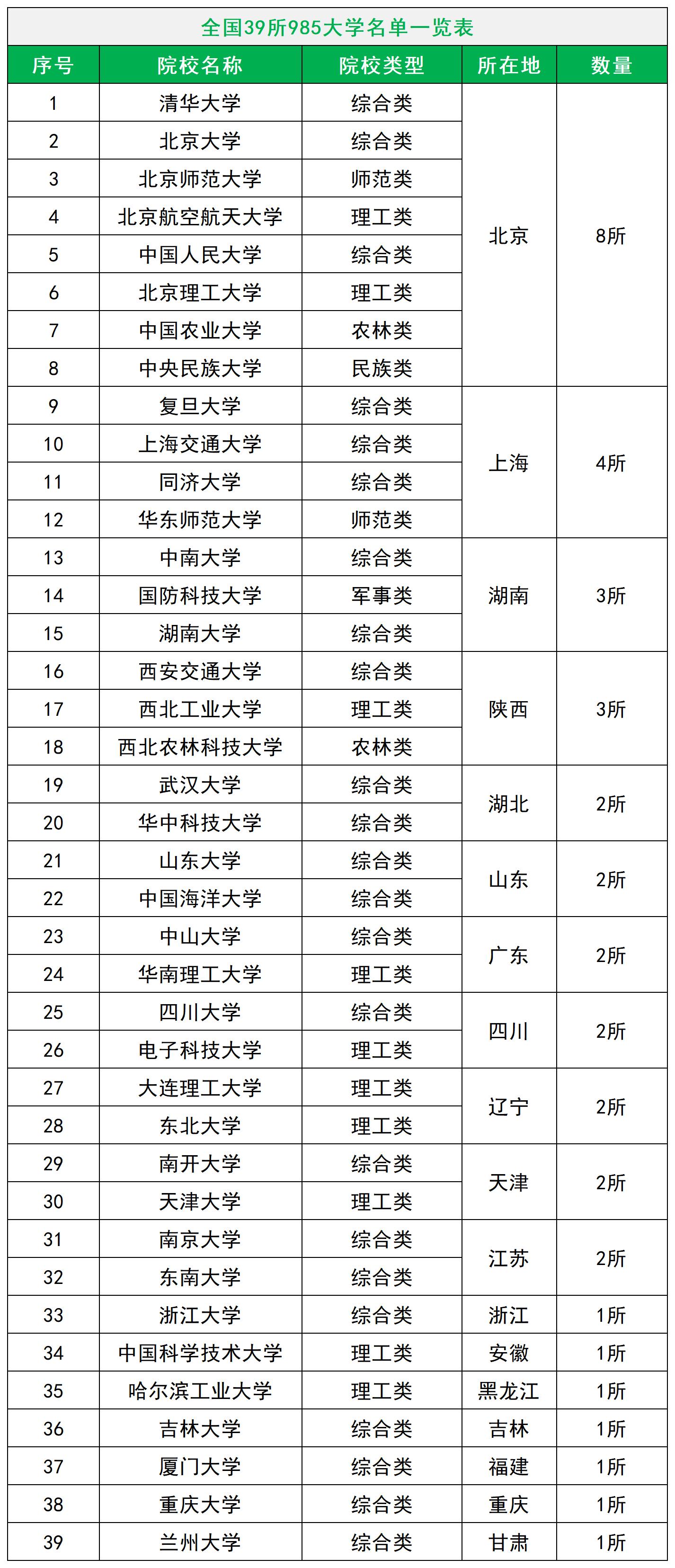 1、北京(8所):清华大学、北京大学、北京师范大学、北京航空航天大学、中国人民大学、北京理工大学、中国农业大学、中央民族大学