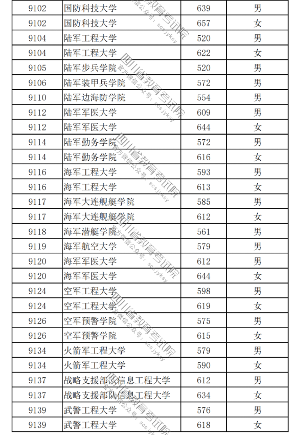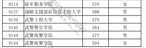 在四川文科中,男生分数最低的是武警海警学院,2023年的投档分是577分;女生分数最低的是陆军勤务学院,2023年的投档分是570分