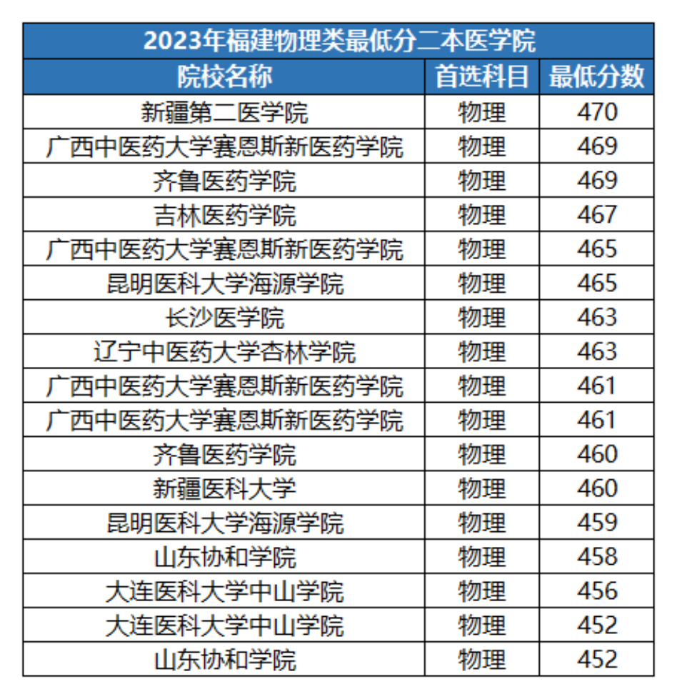 下表为各位考生归纳了福建首选物理科目投档分数最低的二本医学院校名单,根据表格来看,剔除中外合作专业后可以发现,招生分数线最低的医学院校是山东协和学院和大连医科大学中山学院,招录分数均为452分。