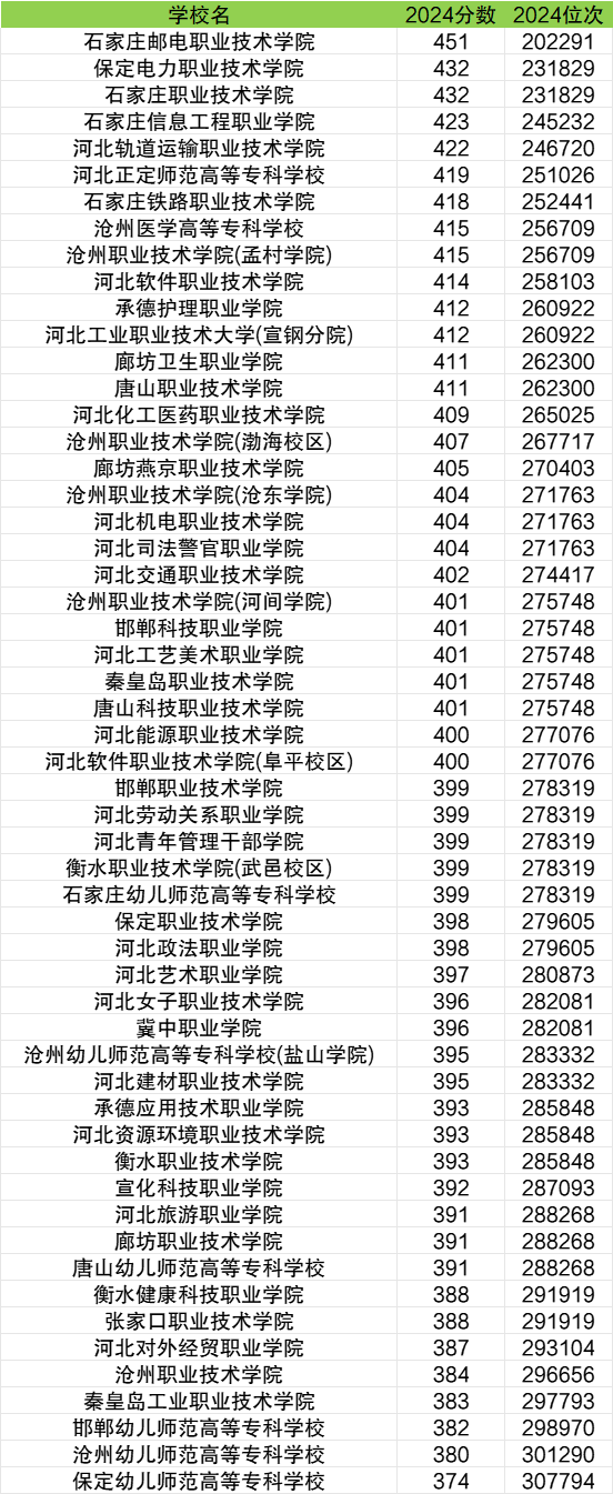 2024年河北物理类收分最低的公办大专是保定幼儿师范高等专科学校,最低分是374分,对应位次是307794名;收分最高的公办大专是石家庄邮电职业技术学院,最低分是451分,对应位次是202291名。