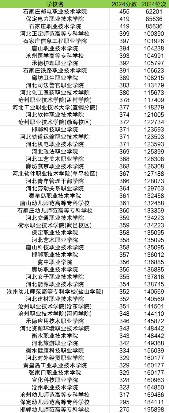 2024年河北历史类收分最低的公办大专是邯郸幼儿师范高等专科学校,最低分是275分,对应位次是195898名;收分最高的公办大专是石家庄邮电职业技术学院,最低分是455分,对应位次是62201名;