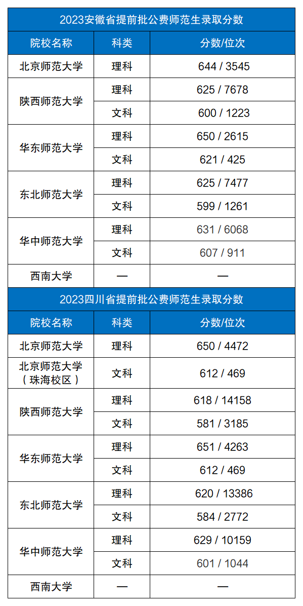 以2023年这六所院校在四川和安徽的提前批公费师范生招生情况为例,小编整理出了它们的录取分数线情况,已经附在下方。