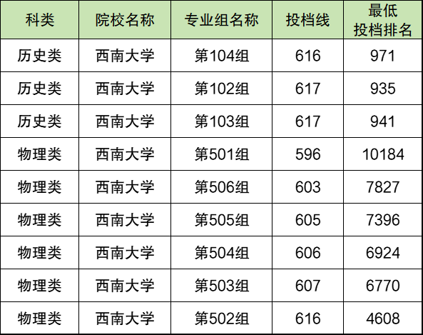 历史类:002专业组586分(选考不限)、703专业组593分(选考政治)、904专业组586分(选考地理)