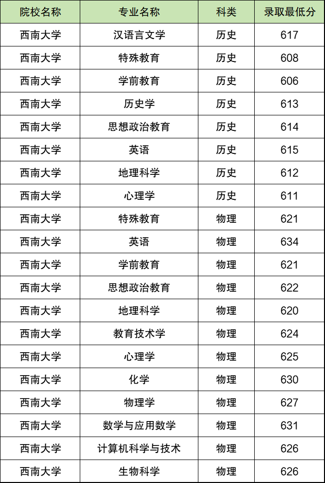 2025年西南大学公费师范生在四川最低录取分数线为历史类630分、物理类643分。